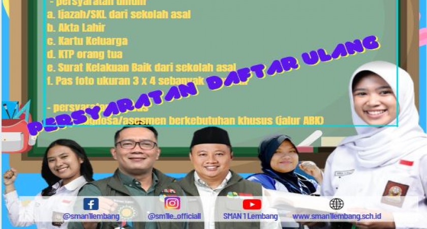 Berikut syarat dan dokumen yang perlu dipersiapkan/dibawa ketika akan melakukan daftar ulang Calon Peserta Didik Baru Tahun Ajaran 2020/2021 di SMA Negeri 1 Lembang.
