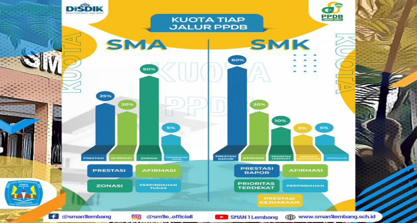 Hallo Sm1lenial,..kembali lagi Admin mau share info tentang PPDB 2021, Kali ini info tentang Kuota atau besaran jumlah masing-masing jalur dalam PPDB 2021, Jalur Prestasi baik Akademik atau non akademik memiliki kuota 25% dari seluruh kuota Sekolah, berikutnya ada jalur Afirmasi sebanyak 20% dan Jalur perpindahan Tugas yakni 5% dimana 3 jalur tersebut merupakan jalur yang dibuka pada Tahap I, sedangkan pada Tahap II yaitu kuota jalur Zonasi sebesar 50%, sudah menentukan pilihan mau daftar di jalur mana?